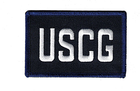 USCG small rectangle blue - 4.5"wx2"h rectangle - White 'USCG' on dark blue black cloth with black merrowing. Velcro backing. 2006- No design ... ^.Five or more (5+) patches in bulk available at quantity discounted prices (PayPal or cash rebate given on order fulfillment or inquire).